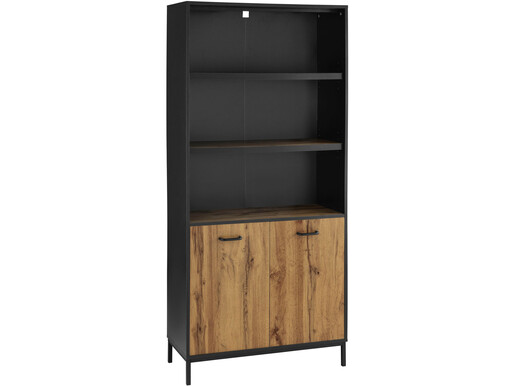 Der große Bücherschrank RANGER präsentiert sich im dualen Design: Holzoptik und matte Oberflächen in schwarz. Der Schrank kann als Aktenschrank genutzt werden und bietet Ihnen viel Stauraummöglichkeiten. Die Griffe und das Gestell aus Metall setzen moderne Akzente im Industrie-Stil.