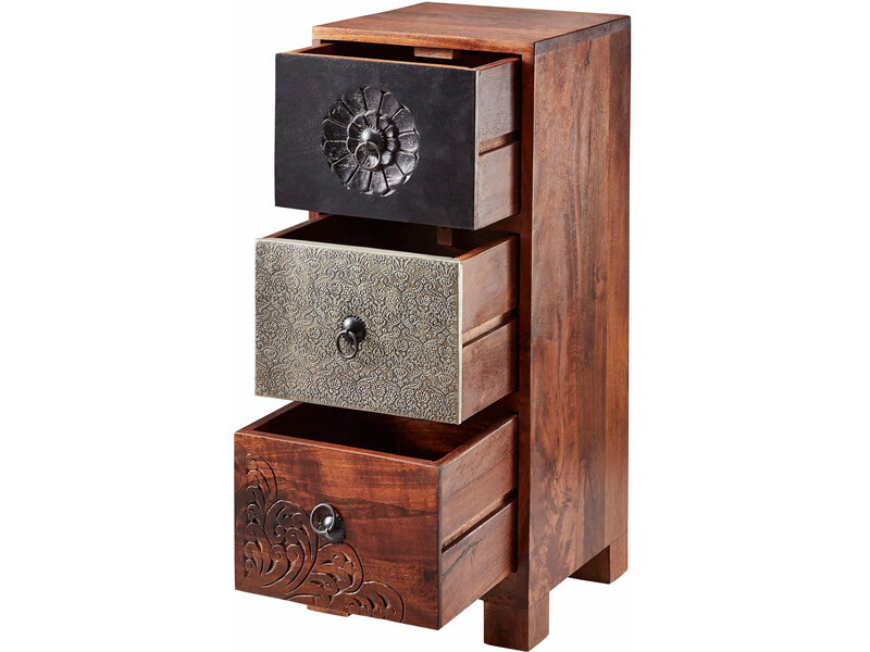 Schubladenkommode MOLLY aus Akazienholz massiv mit 3 Schubladen in aufwendiger Handarbeit gefertigt. Die Kommode setzt tolle Akzente und ist in zwei Größen erhältlich.